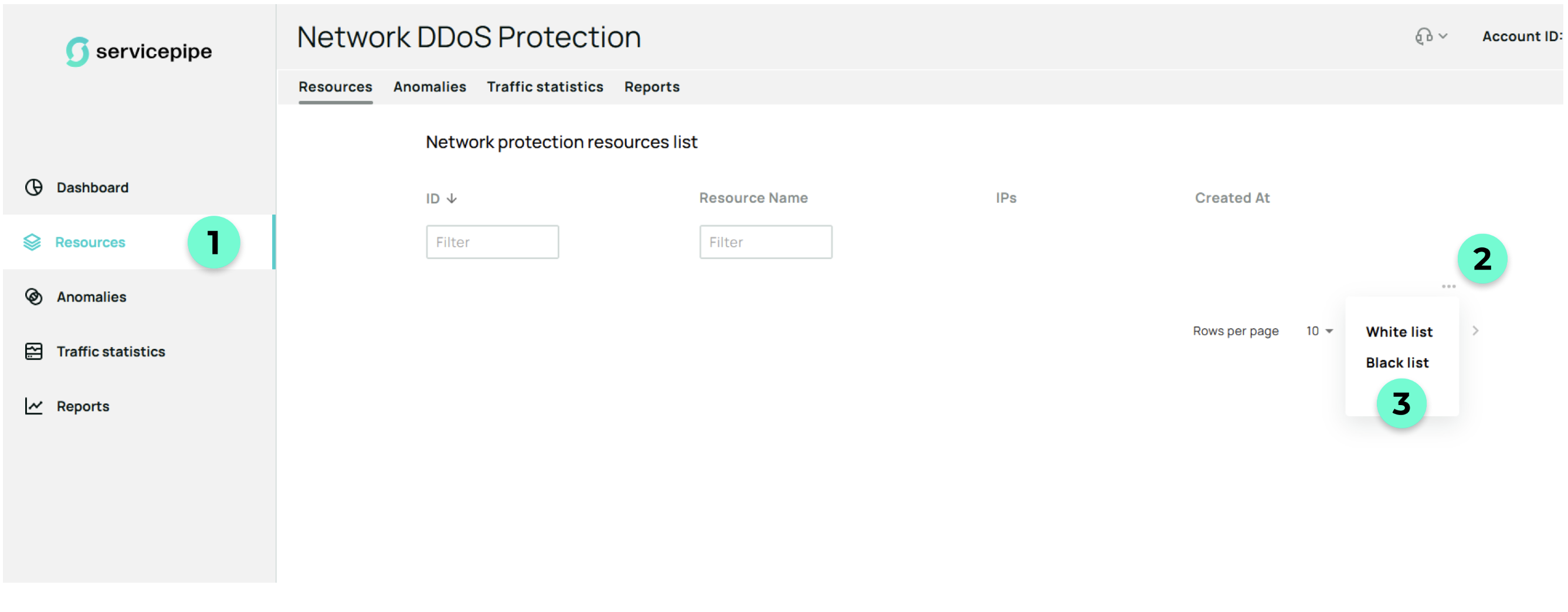 1. Во вкладке Resources, нажать на троеточие, во всплывающем меню выбрать White/Black List